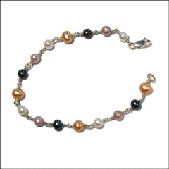 Multi-color cultured pearls and sterling silver bracelet with lobster clasp. Beautiful pink, white, blue/grey and golden colored pearls and sterling silver chain.